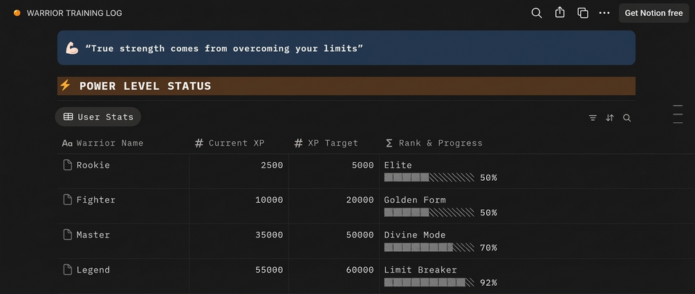 Finally, a gym tracker that matches your energy. This template gamifies your fitness journey, turning your daily exercise into an RPG experience. Gain XP for every workout, unlock legendary transformations, and watch your power level break its limits.