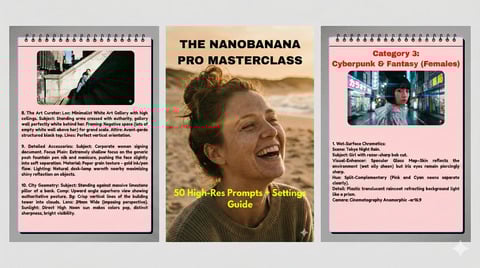 A rich 21-page PDF MasterGuide for Nanobanana (Gemini). Includes 50 Copy-Paste Prompts, Style Keys, and Secret Settings for instant realism